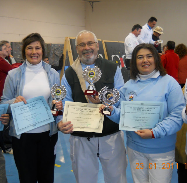 Y aquí la foto de nuestros tres campeones Oro, Plata y Bronce ... tres trofeos más para nuestro Club, en un año en el que pretendemos batir todos los records anteriores. Enhorabuena a los tres, sois unos grandíosos campeones, magníficos arqueros y mejores personas.